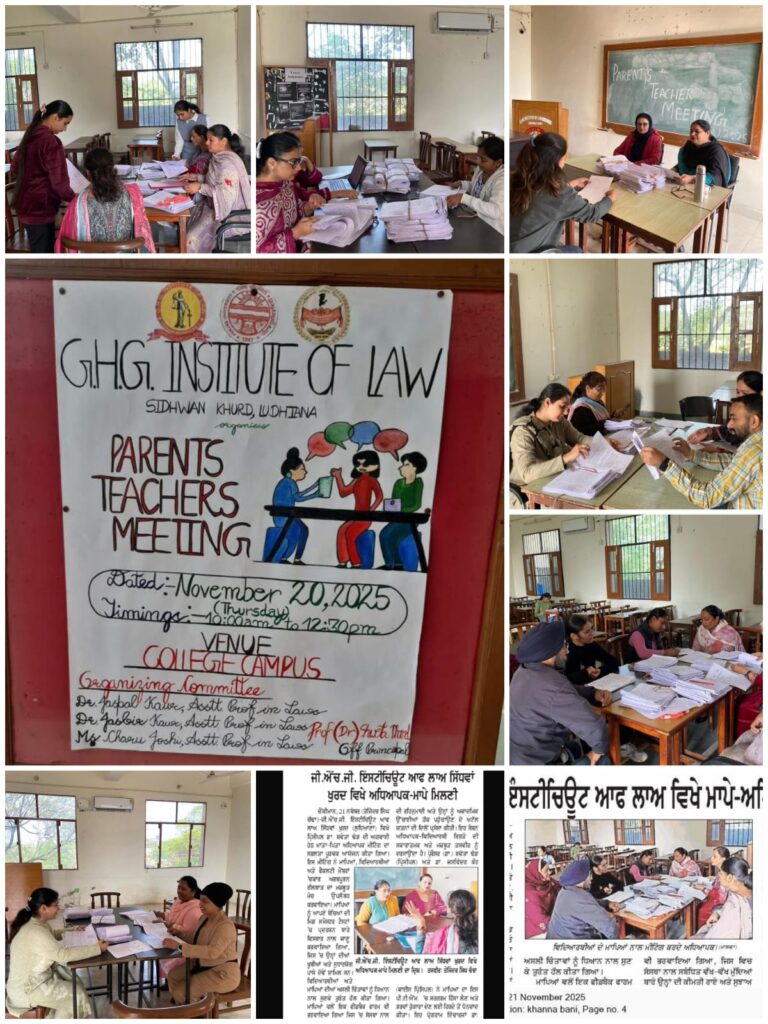 G.H.G. Institute of Law, Sidhwan Khurd, Ludhiana hosted a Parents Teacher Meeting under the able guidance of Off. Principal Dr. Shweta Dhand on 20th November, 2025. It was a day of interaction with the Parents and Students making them aware of their strengths and drawbacks in the Mid Semester Test. Their genuine problems were tackled and dealt with. Parents were made aware about the performance of their wards in these exams. A feedback form was also filled up by the parents concerning different questions about the institution. There complaints were taken into consideration. It was an enriching experience for all of us. The Parents appreciated the Faculty for their hard work and dedication towards the students to help them achieve their goals depicting a true picture of Teacher-Student relationship in a very positive manner. Dr. Shweta Dhand, (Off. Principal) and Dr. Jaswinder (Vice Principal)thanked the parents for their serious response to PTM.