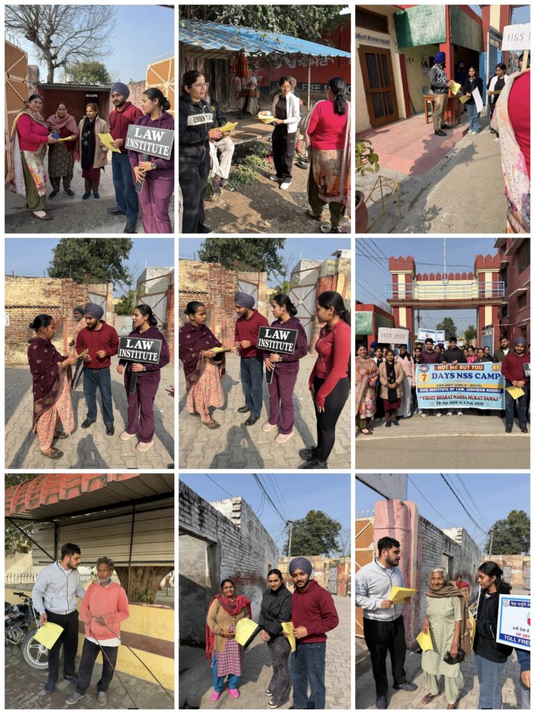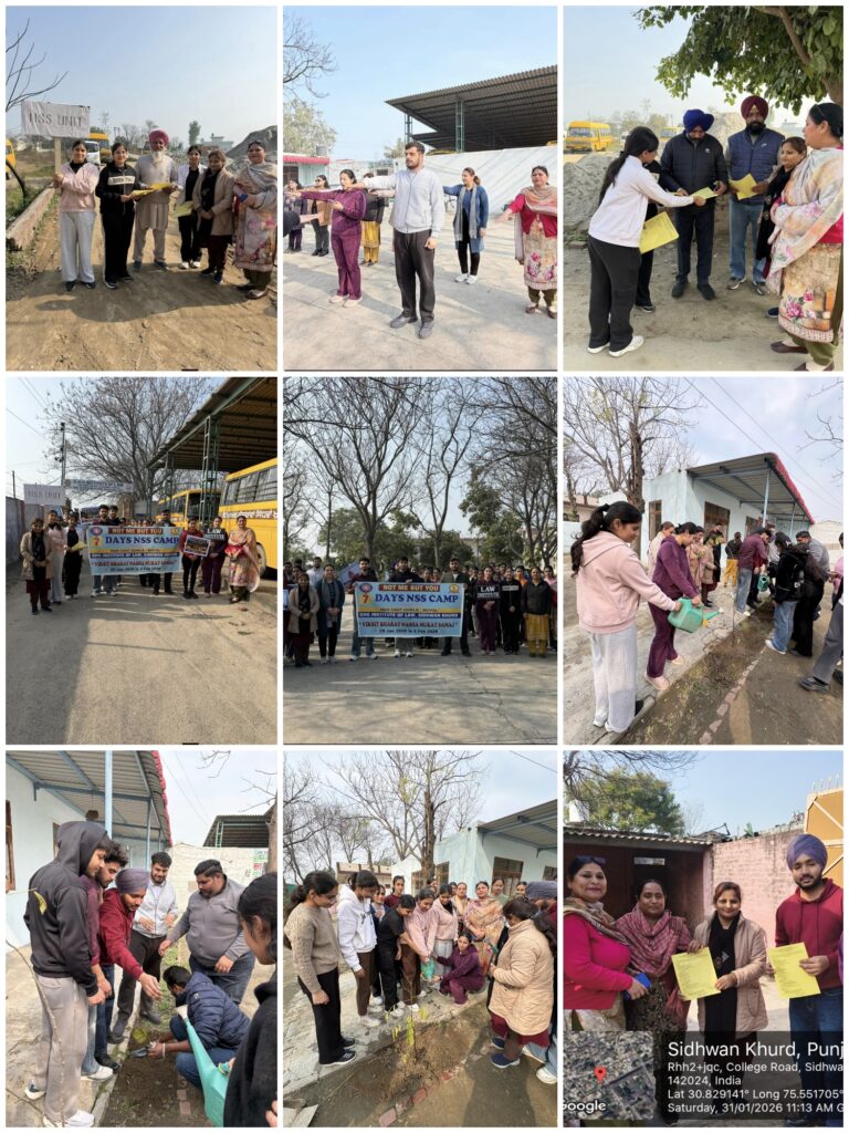 The third day of the NSS Seven Days Camp at G.H.G. Institute of Law, Sidhwan Khurd, Ludhiana was conducted successfully with active participation of NSS volunteers. The activities were organized under the guidance of the Respected Officiating Principal, Dr. Shweta, and the leadership of Dr. Jaspal Kaur (Programme Officer NSS) and Dr. Neelam Rani (College Incharge, NSS). The day began with Physical Training (PT) exercises to promote fitness and discipline among volunteers.The main activities included a Pledge Ceremony on “Say No to Drugs”, followed by a Drug Awareness Rally and pamphlet distribution in the nearby village to spread awareness about the harmful effects of drug abuse. A Tree Plantation Drive was also conducted to promote environmental conservation. Additionally, a Cleanliness Drive was carried out in the camp area and surrounding places to support the mission of Swachh Bharat Abhiyan.The day was meaningful and productive, helping volunteers develop discipline, social responsibility, and environmental awareness, truly reflecting the NSS motto “Not Me, But You.”