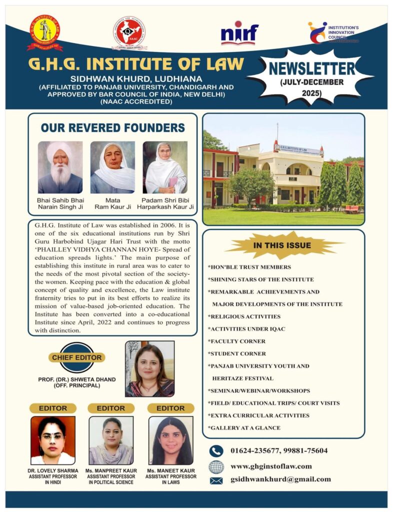 The Releasing Ceremony of the Newsletter for the session July–December 2025 was successfully organized on *06.02.2026* at the institution. The event was conducted under the able leadership and guidance of Dr. Shweta Dhand, Officiating Principal, whose constant support and encouragement played a pivotal role in the successful execution of the programme.The ceremony was graced by distinguished guests Prof. Parveen Goyal, Coordinator, NSS, Panjab University, Chandigarh, and Dr. Sonia Sharma, Programme Officer, NSS, Panjab University, Chandigarh. The occasion was further dignified by the esteemed presence of Secretary S. Pritam Singh Johal, Dr. Harmail Singh, and the Principals of sister institutions, whose presence added great value and significance to the event.The Faculty Coordinators of the Newsletter, Dr. Lovely Sharma (Assistant Professor in Hindi), Ms. Manpreet Kaur (Assistant Professor in Political Science), and Ms. Maneet Kaur (Assistant Professor in Laws), were appreciated for their dedicated efforts in compiling, editing, and presenting the newsletter in a comprehensive and well-structured manner.